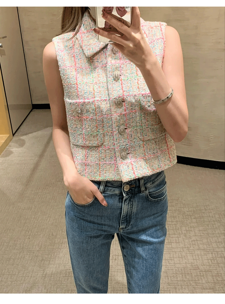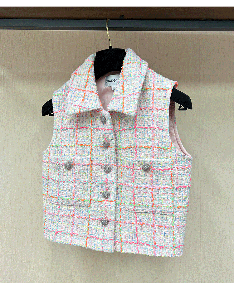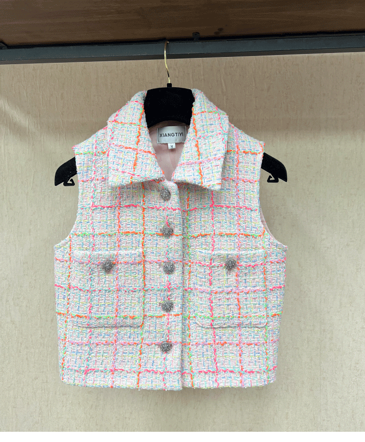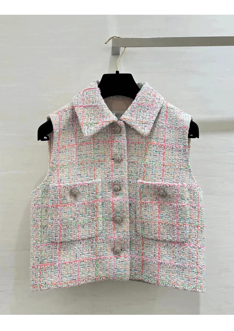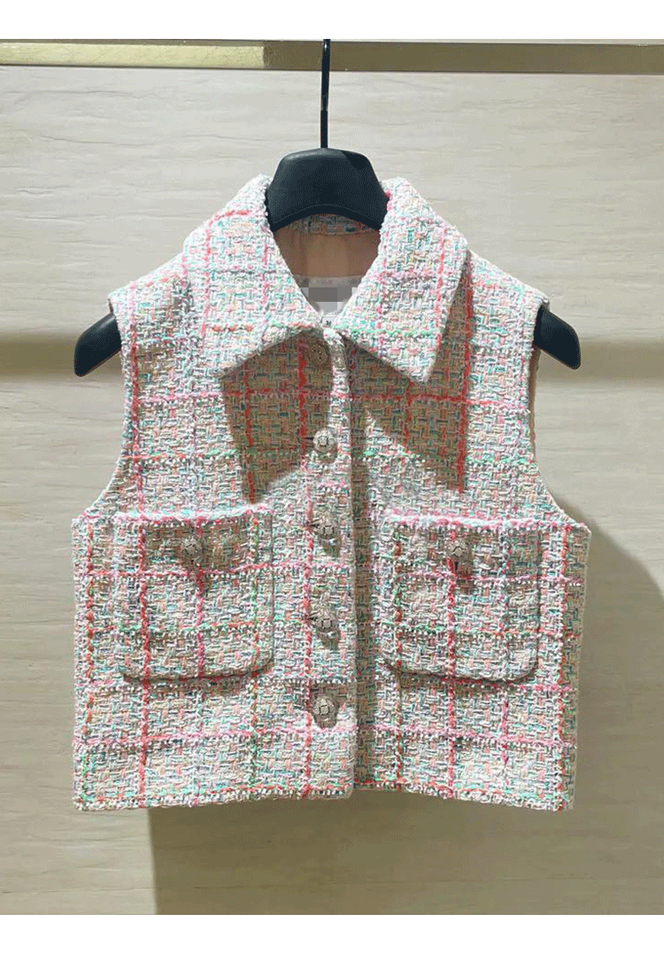 2024 early spring vest women's lapel vest colored plaid tweed celebrity temperament slim top