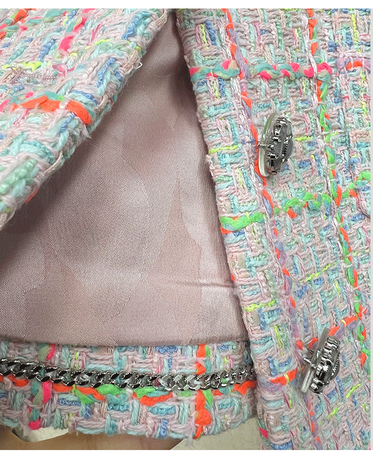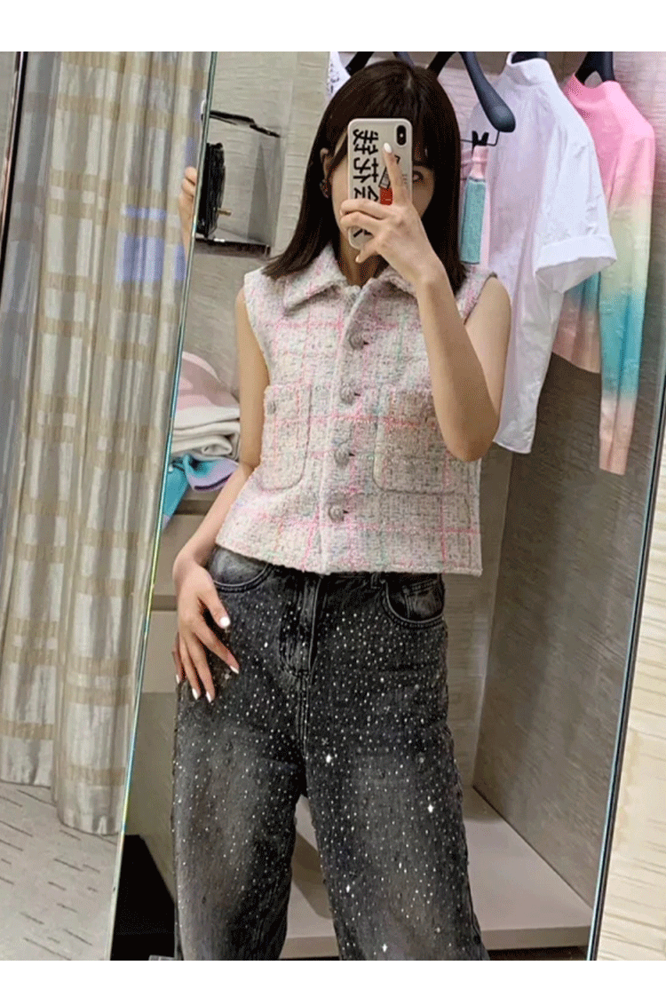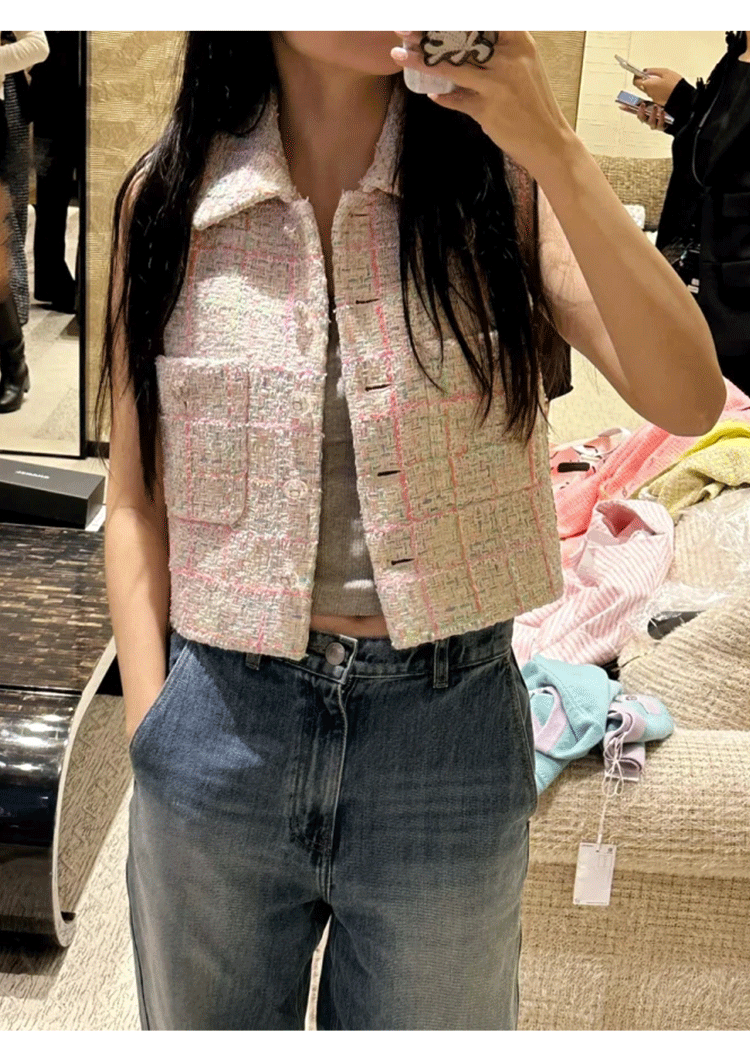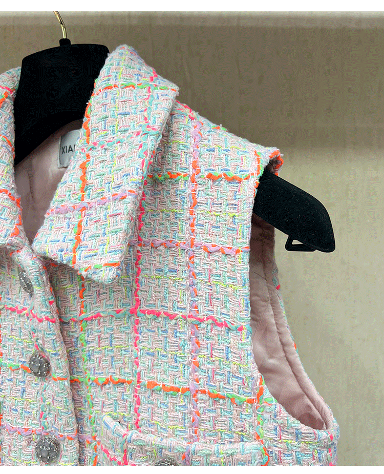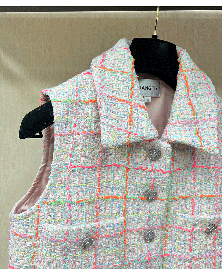 2024 early spring vest women's lapel vest colored plaid tweed celebrity temperament slim top