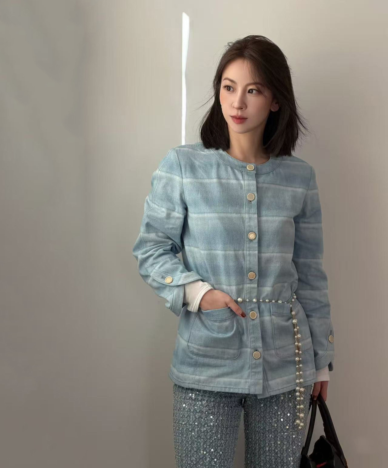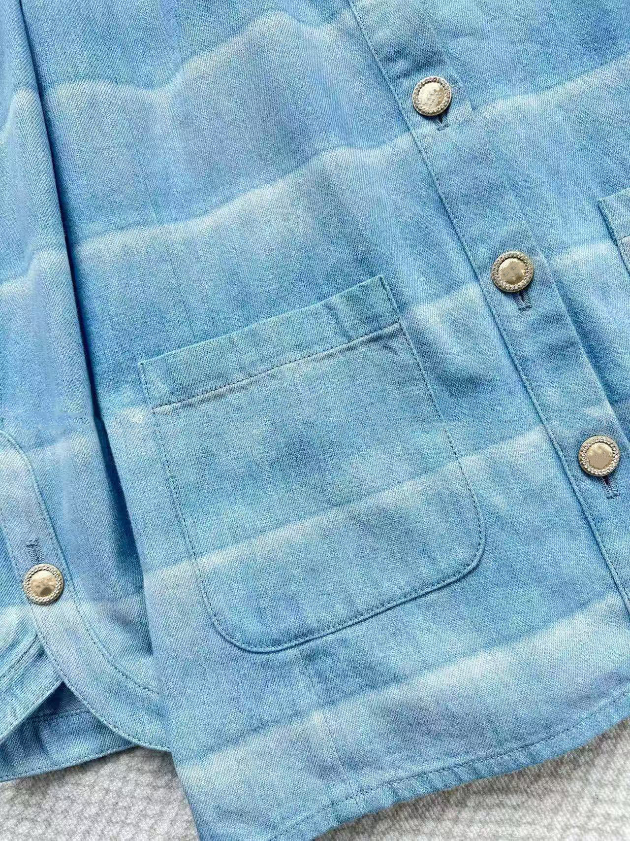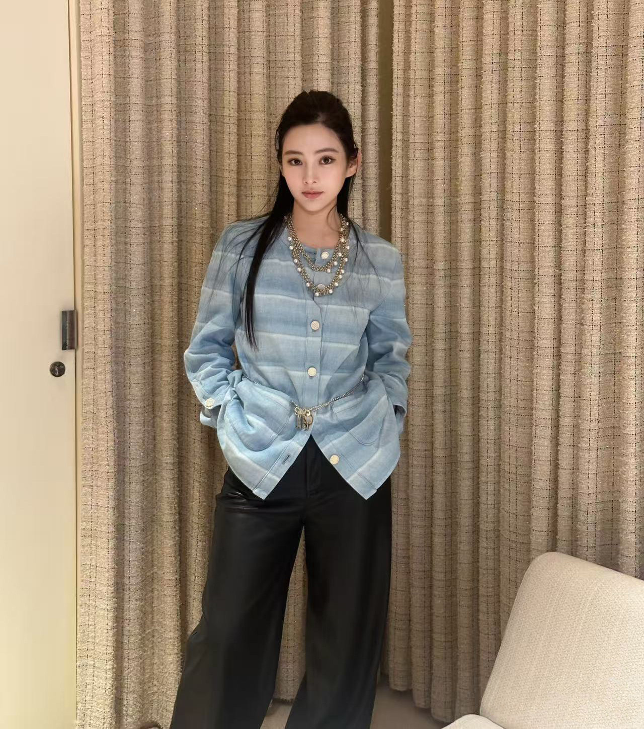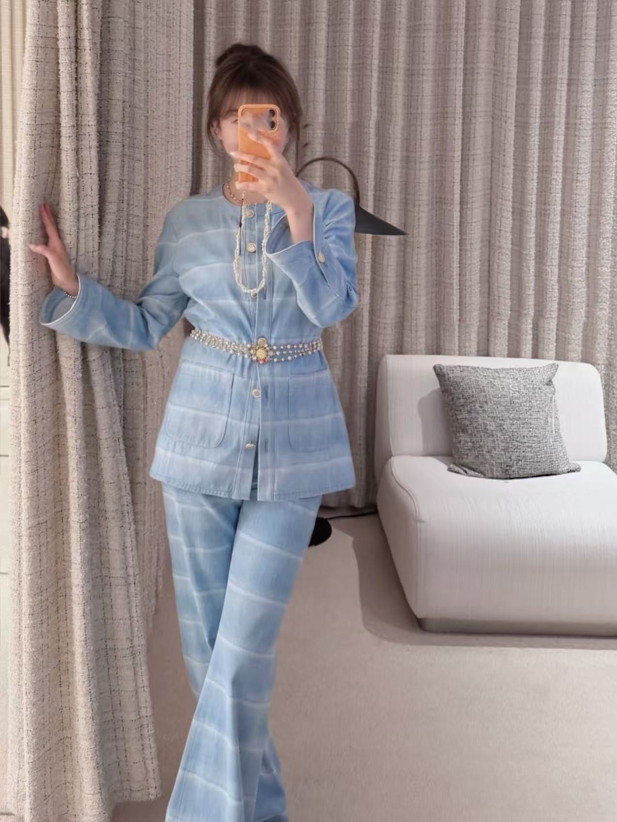 2025 autumn and winter fashion foreign style washed blue and white striped single-breasted cardigan jacket high waist straight wide-leg pants