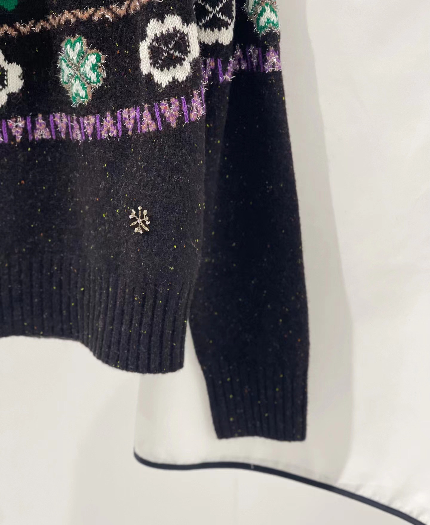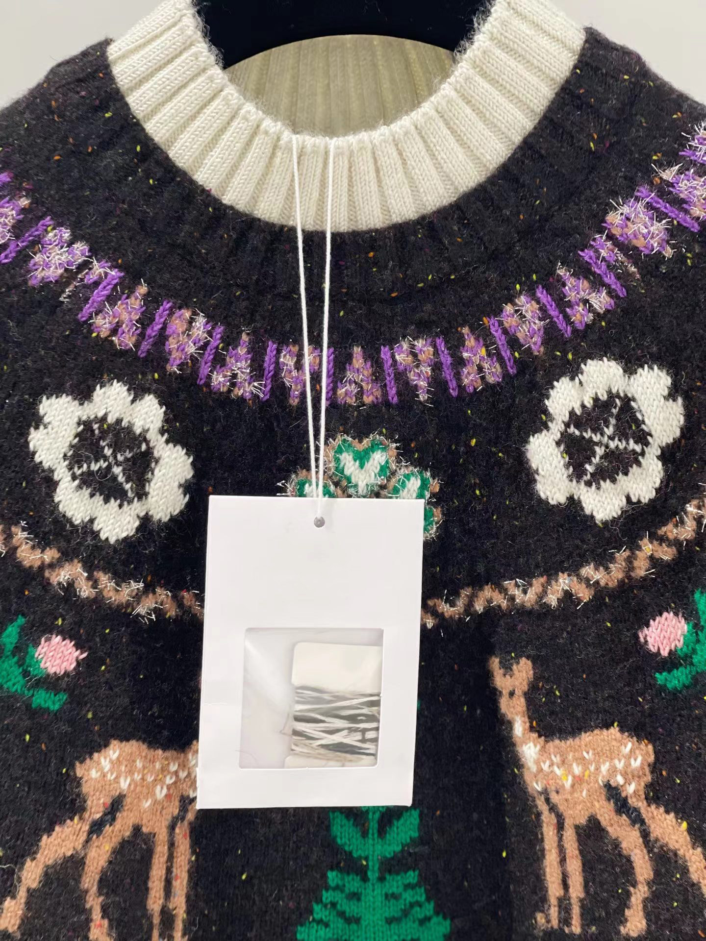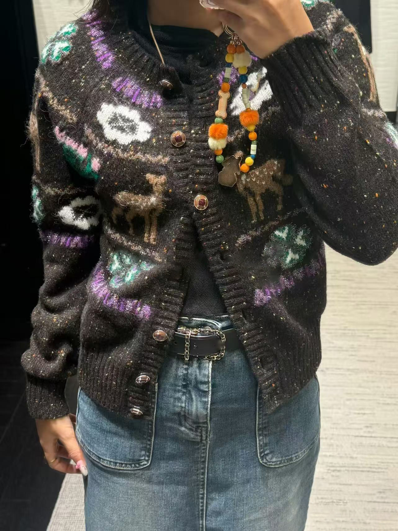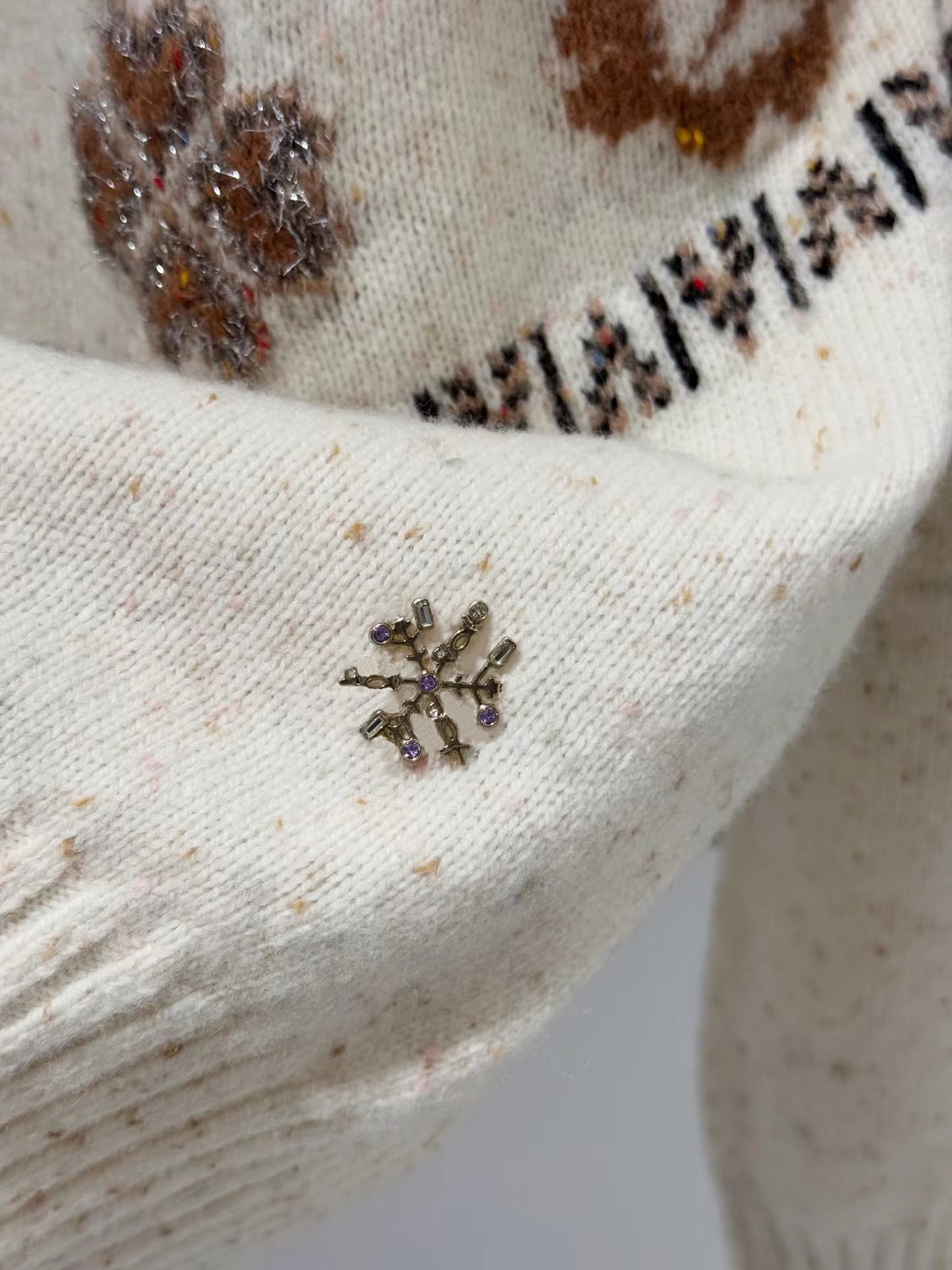 2025 autumn and winter heavy industry animal snowflake multi-element embroidery ski cashmere brown knitted cardigan pullover long sleeve