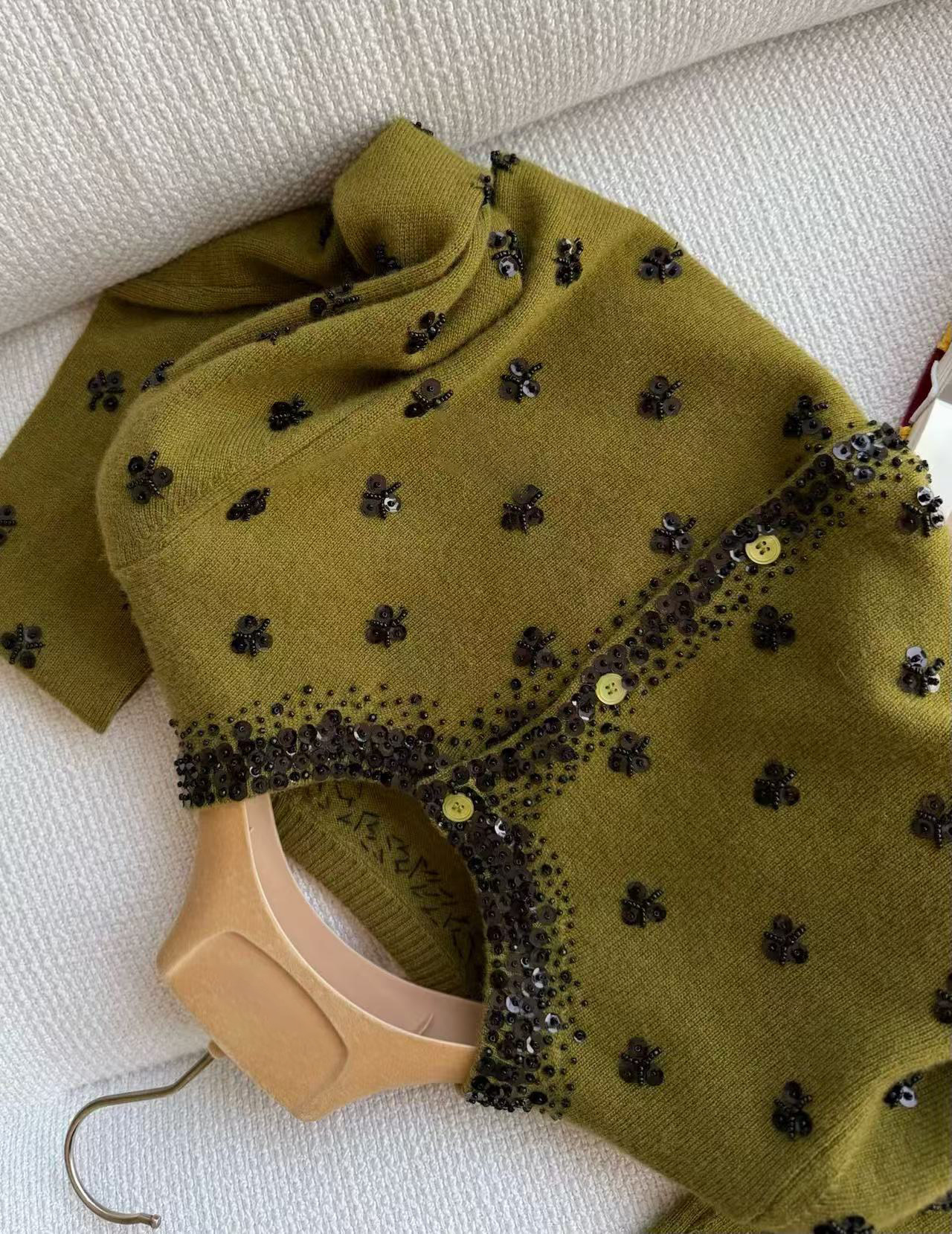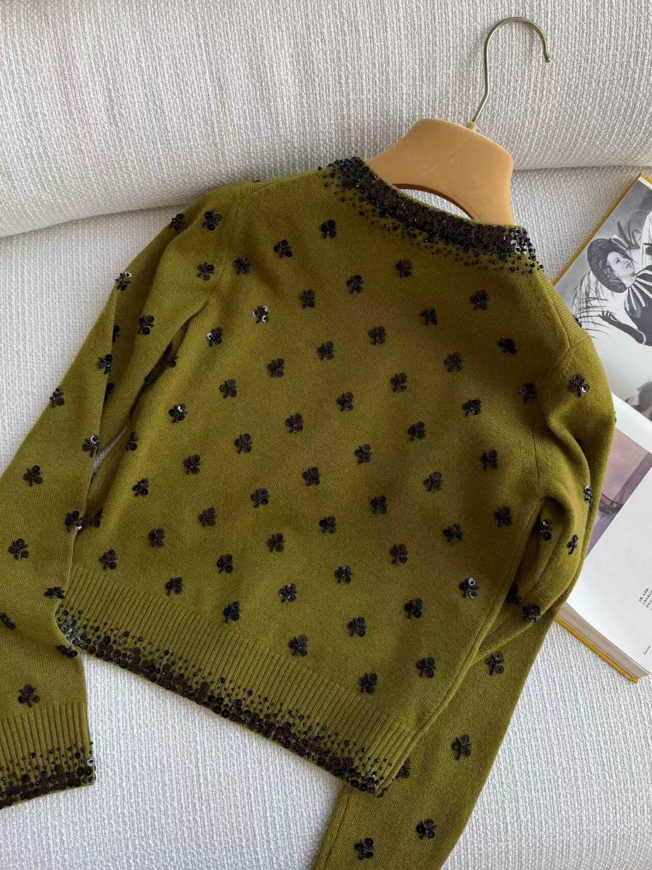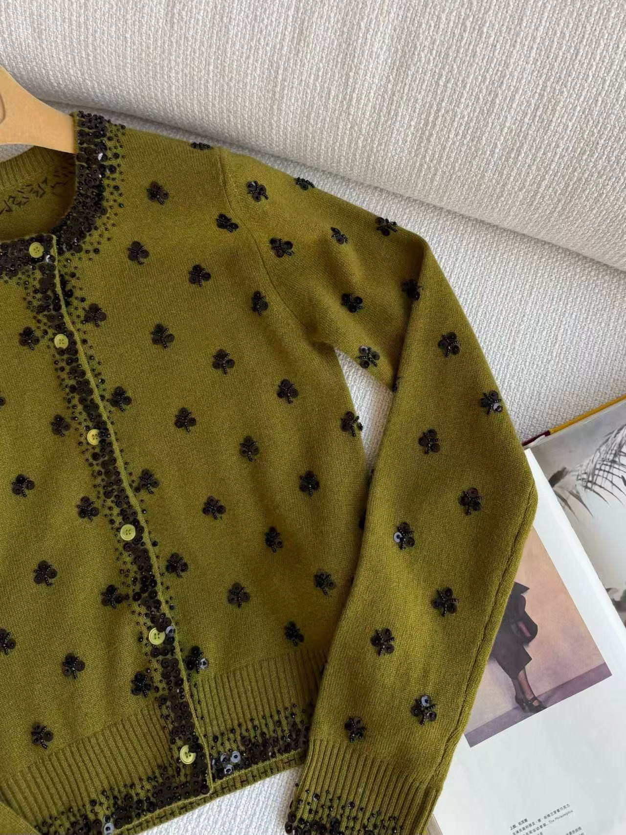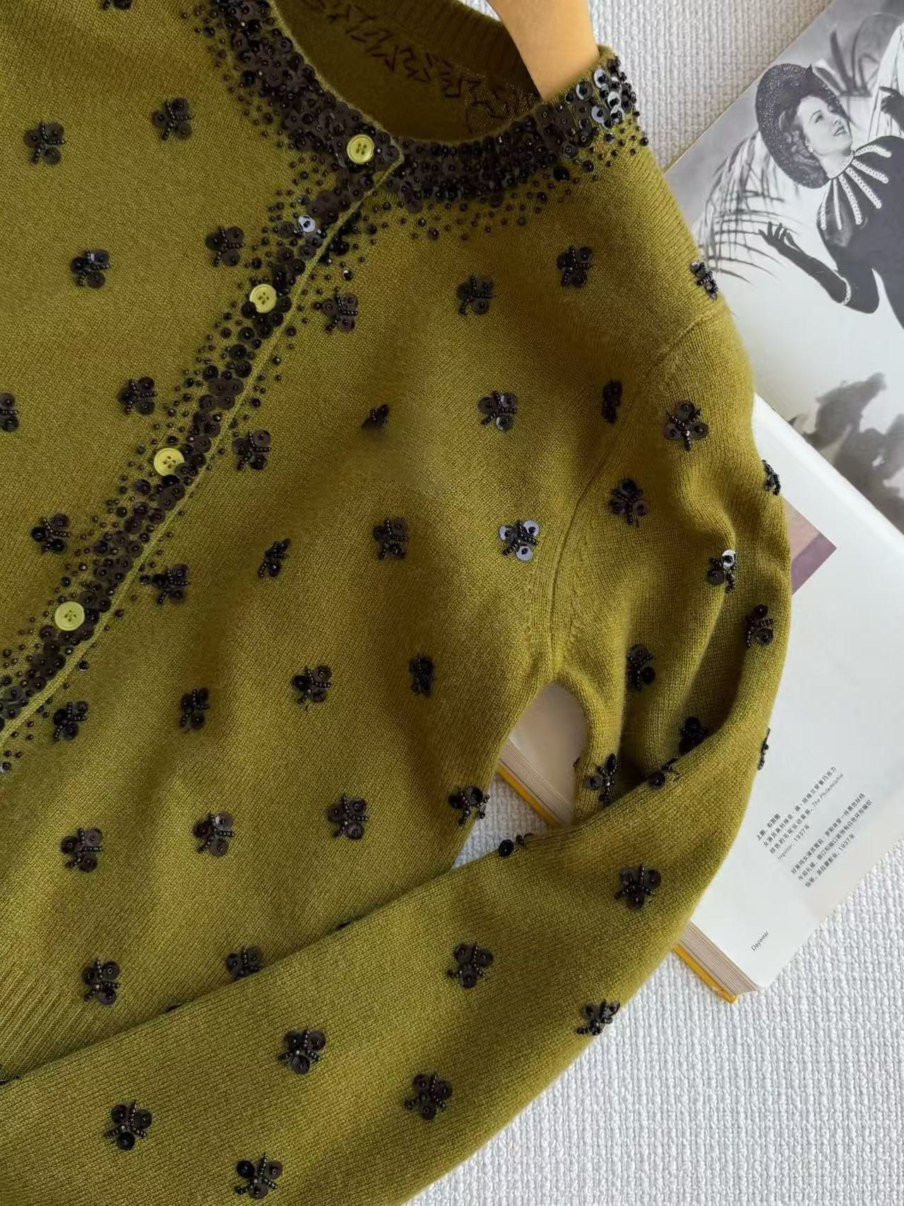 2026 early spring college wind heavy industry retro handmade three-dimensional bead thousand gold round neck cashmere knitted cardigan jacket women