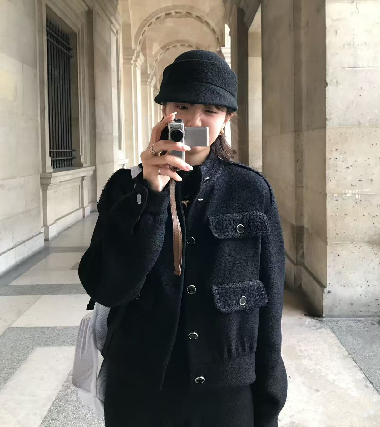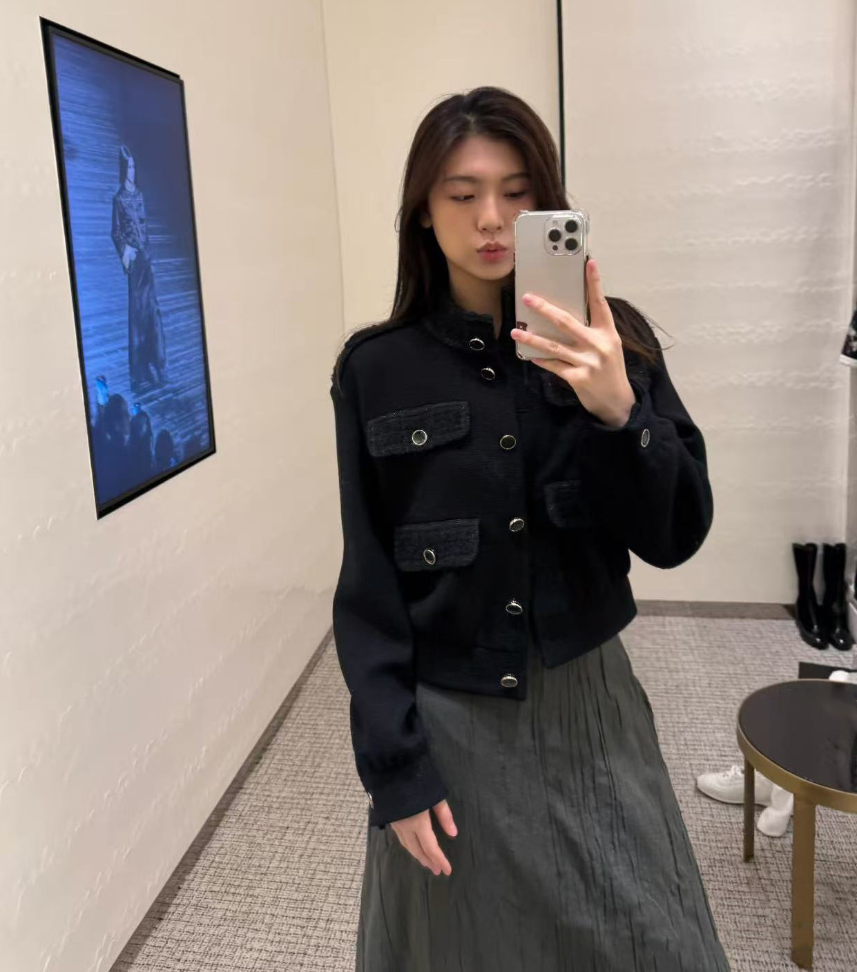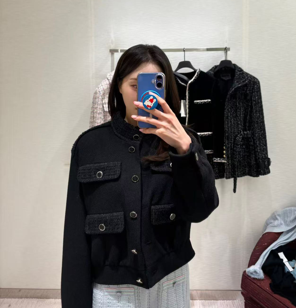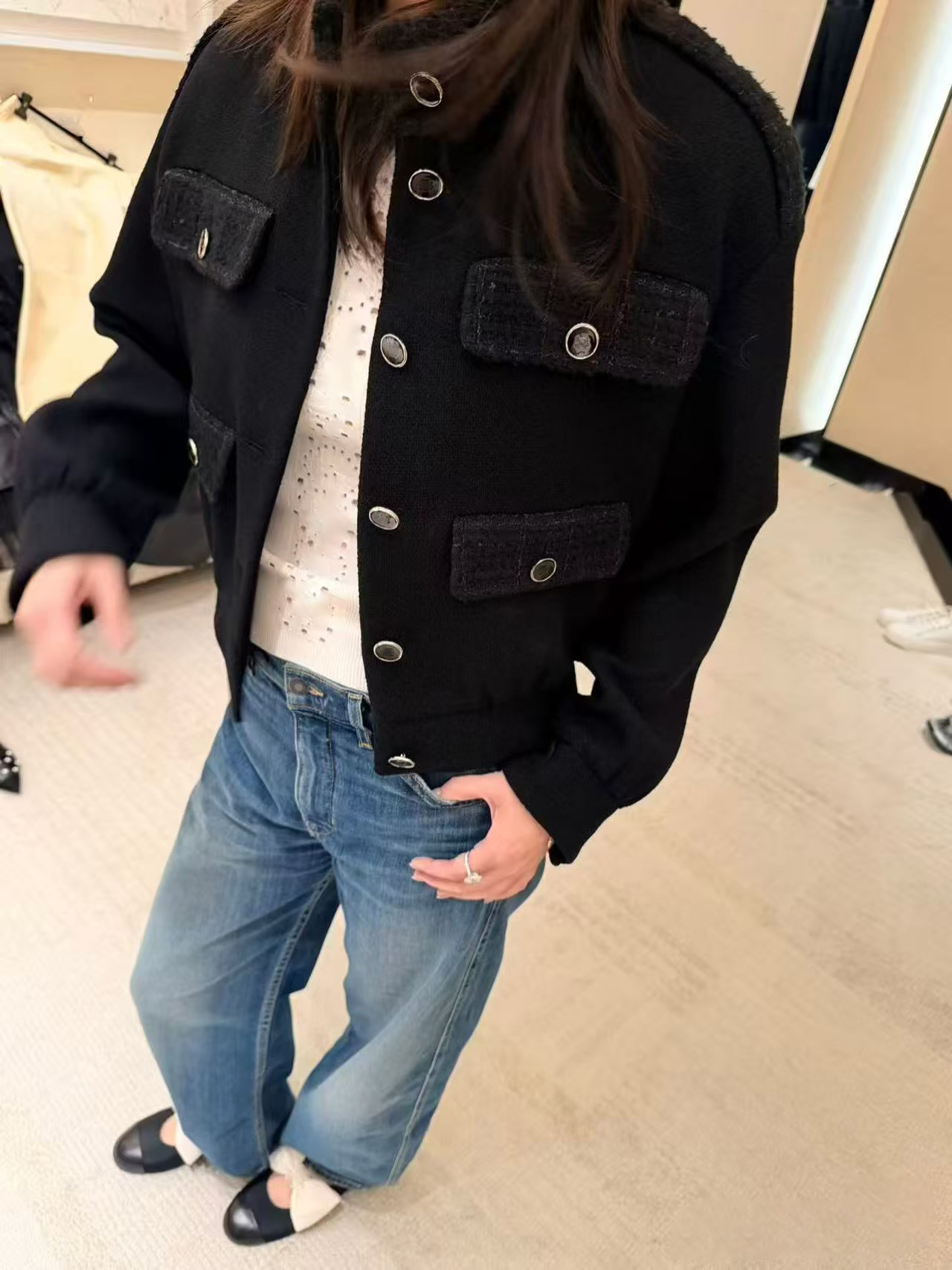 2026 early spring contrasting colors heavy industry classic high-end tweed splicing stand-up collar four pockets black jacket short coat
