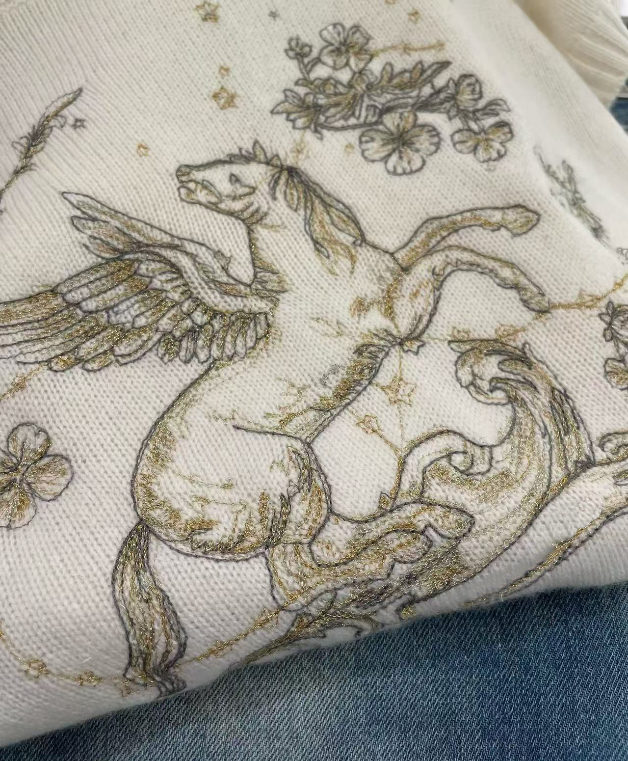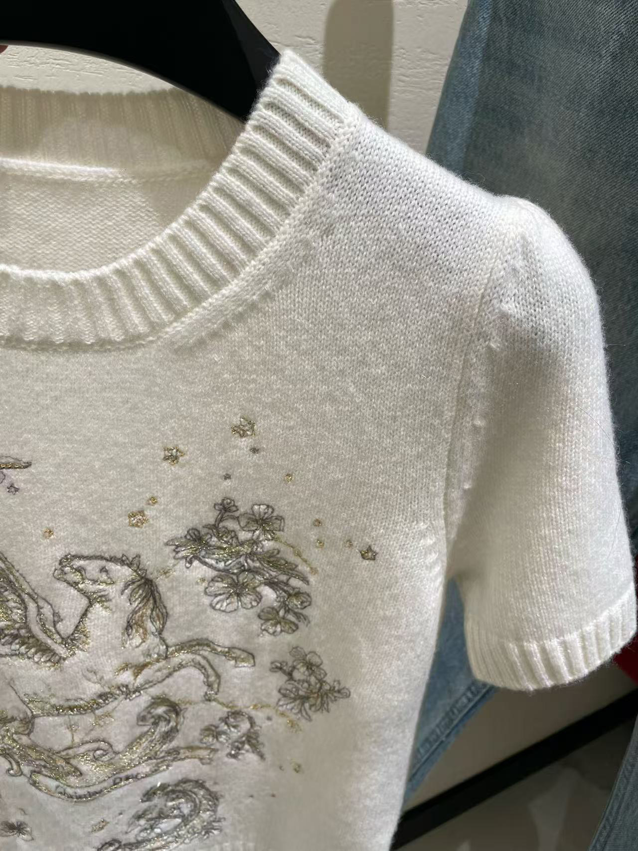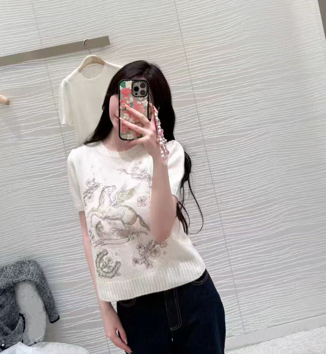 2026 early spring design fashion sense foreign style animal letter embroidery round neck short sleeve cashmere soft knitted top women
