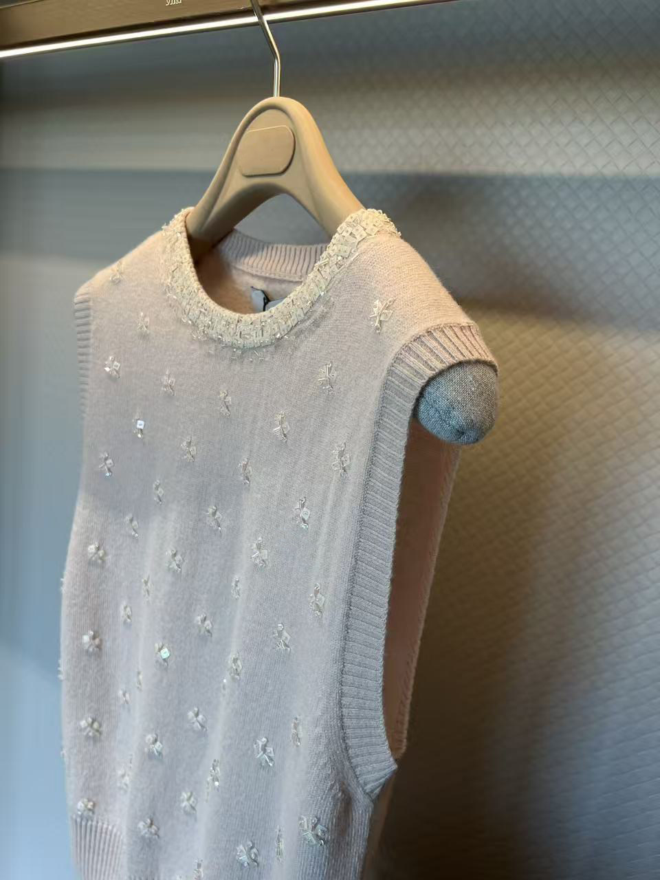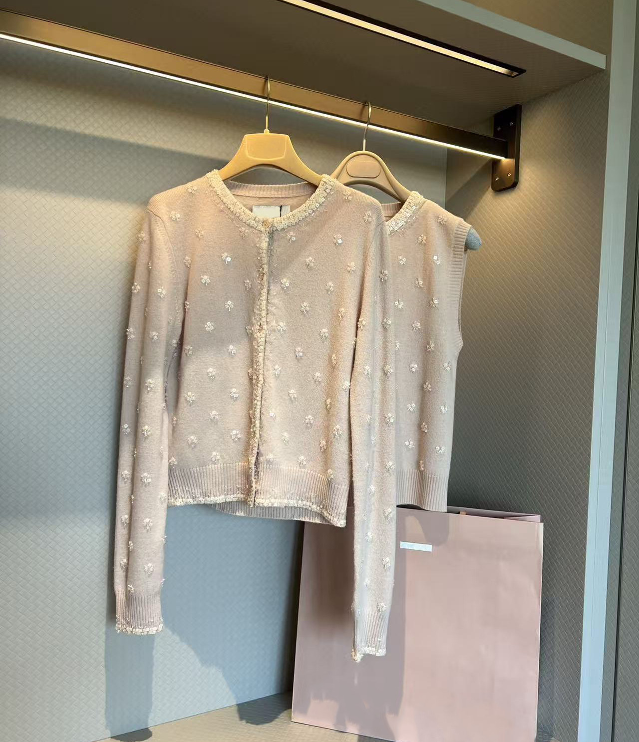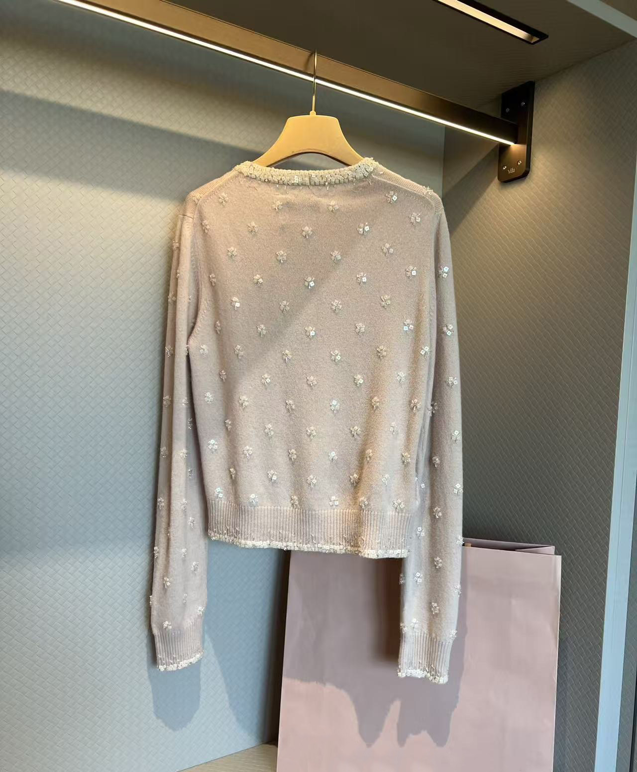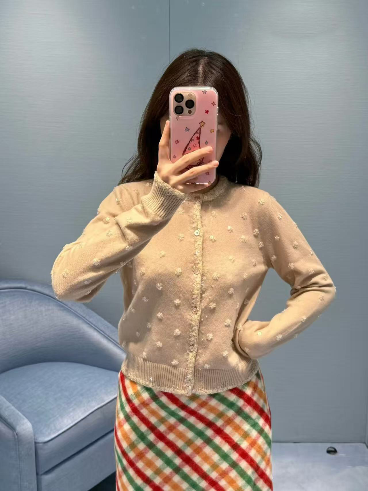 2026 early spring design French high-end heavy industry three-dimensional bead thousand gold round neck cashmere knitted cardigan women