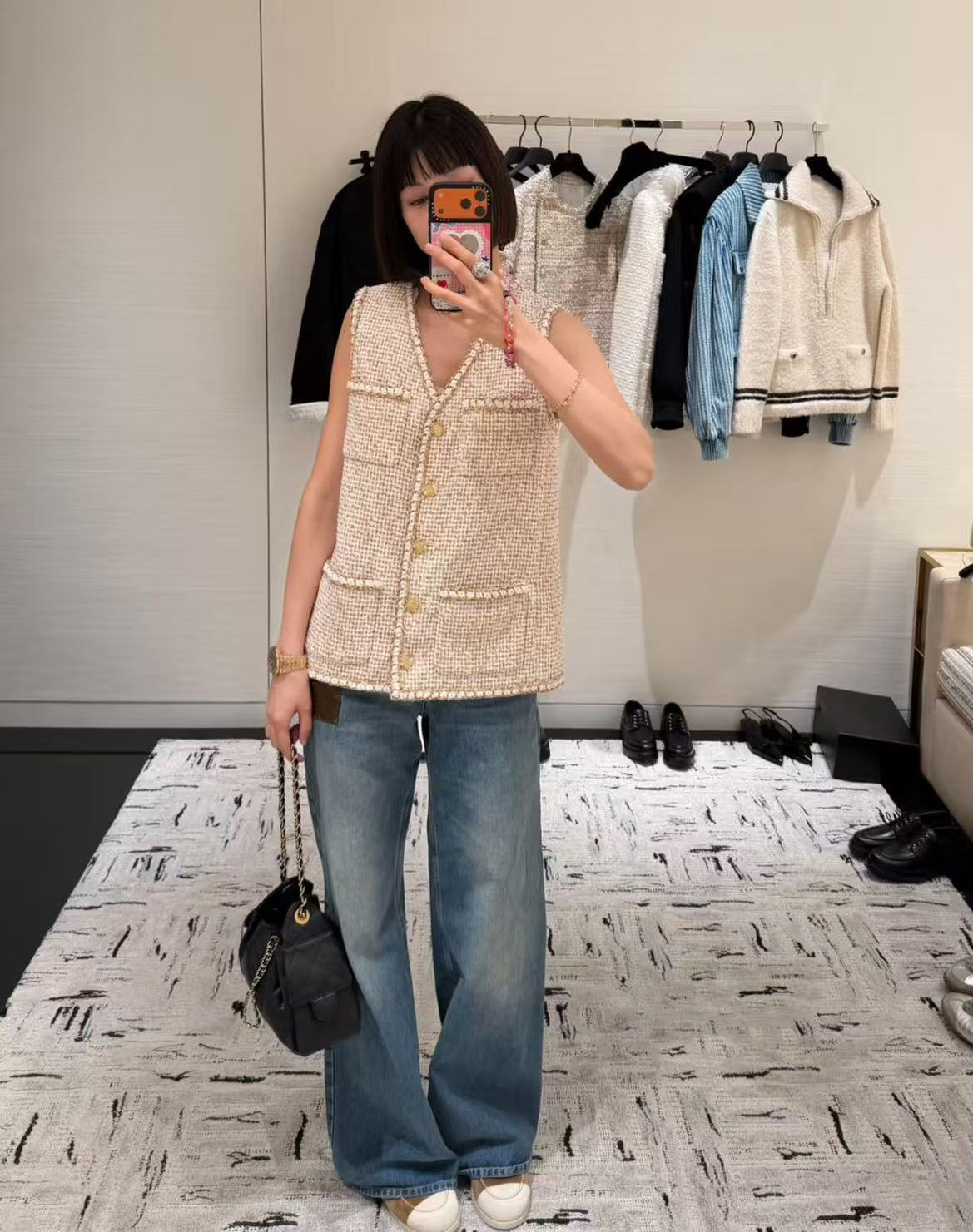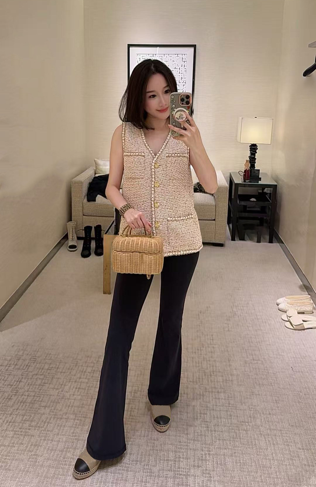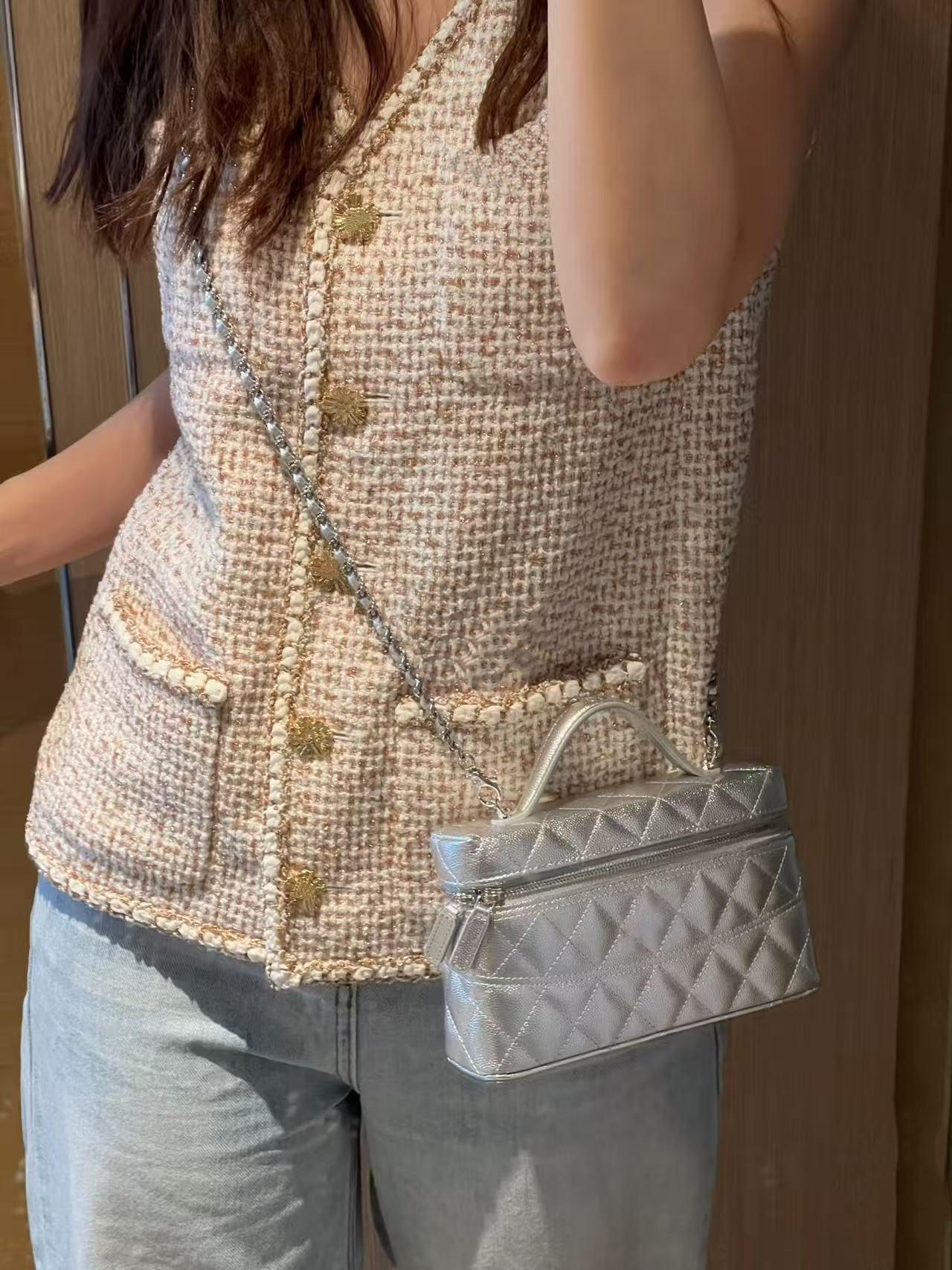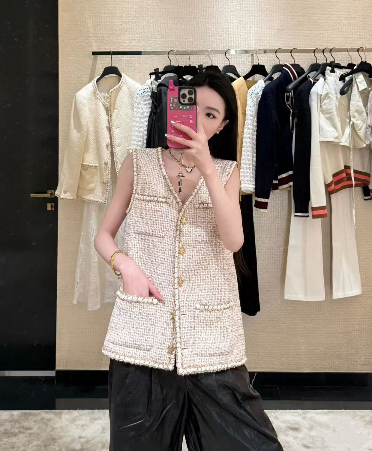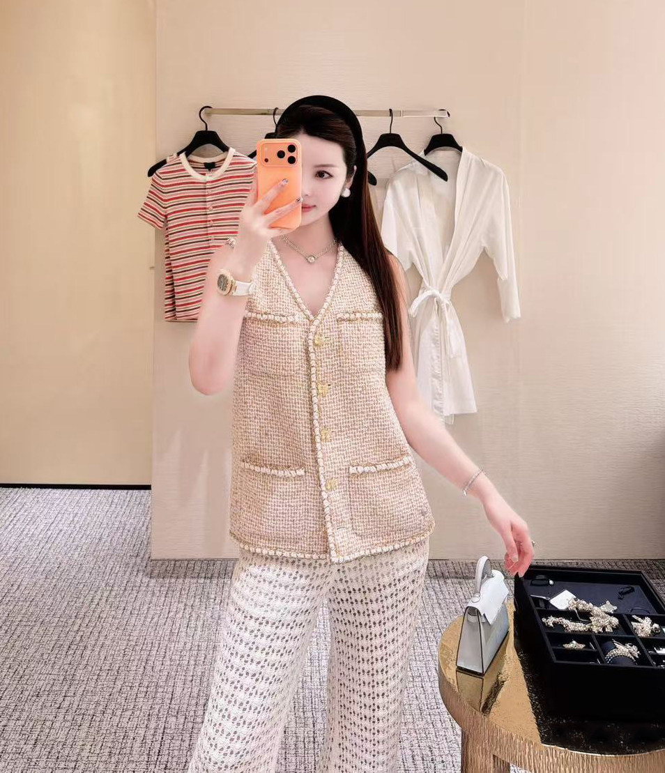 2026 early spring French contrasting color high-end design v-neck foreign style four pockets single-breasted tweed vest women