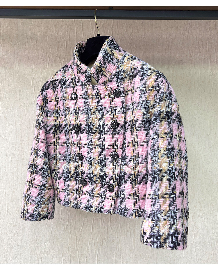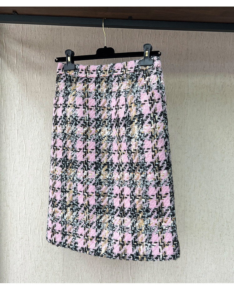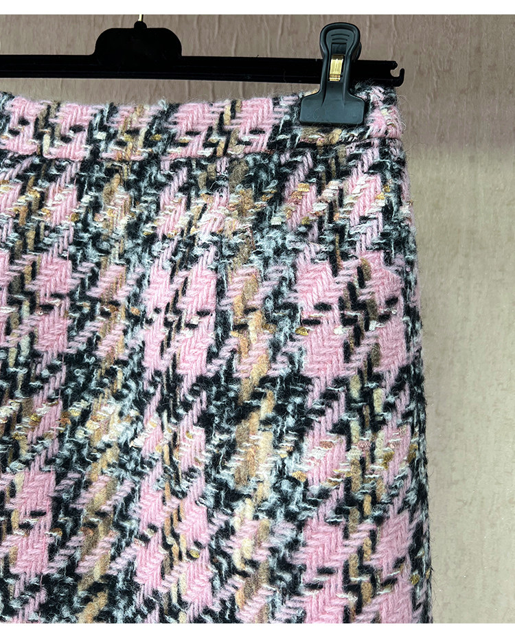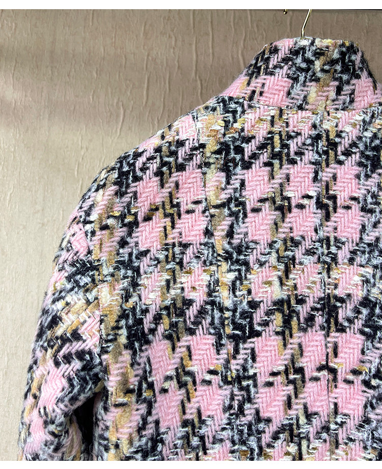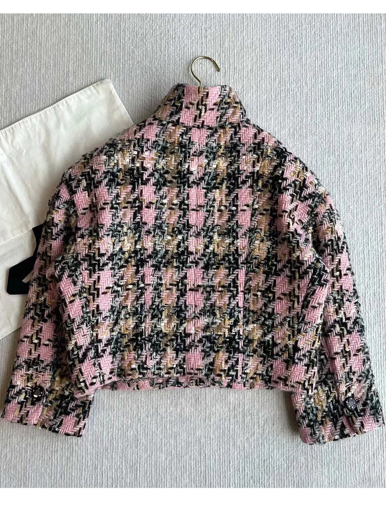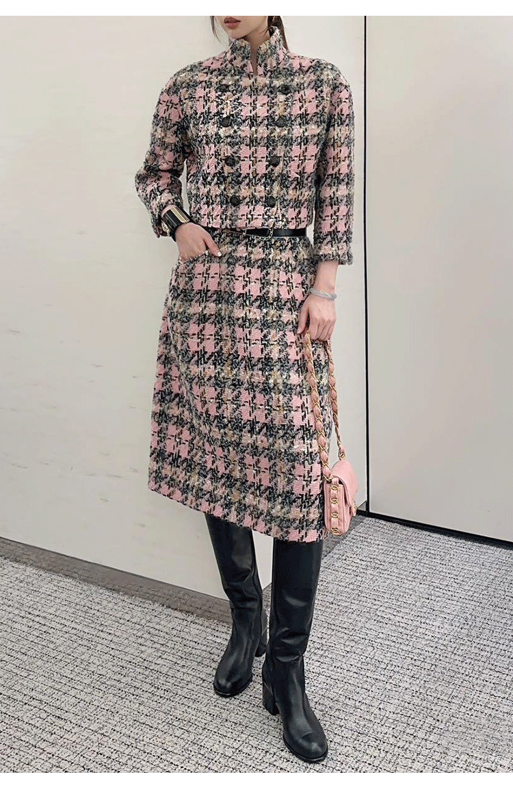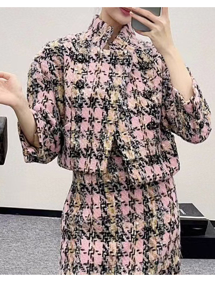 Autumn and winter new jackets, women's stand-up collar skirts, wool knitted tweed pink plaid suits, celebrity women's clothing