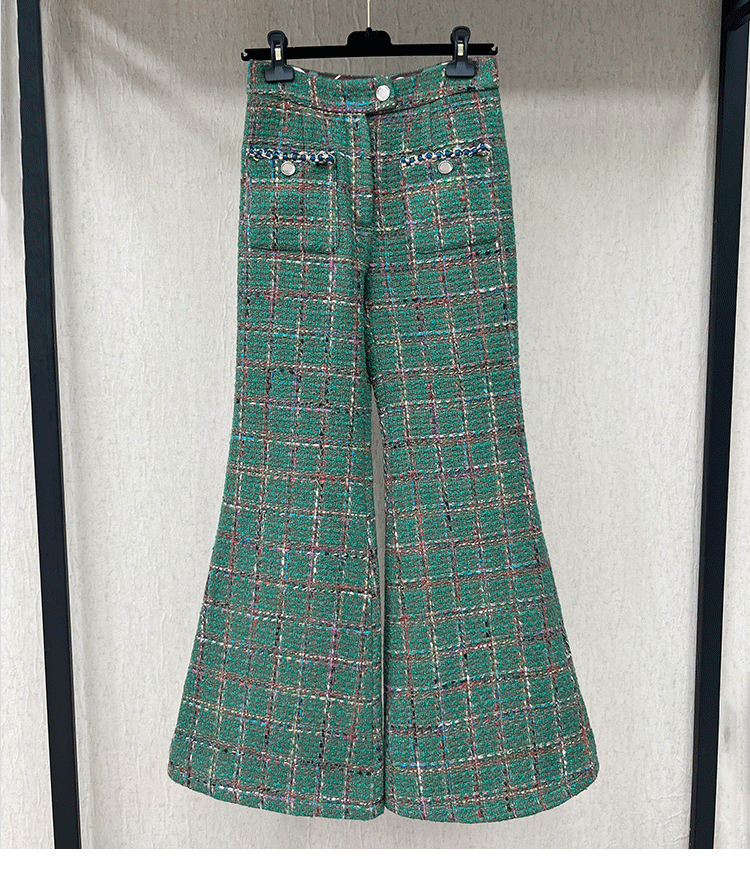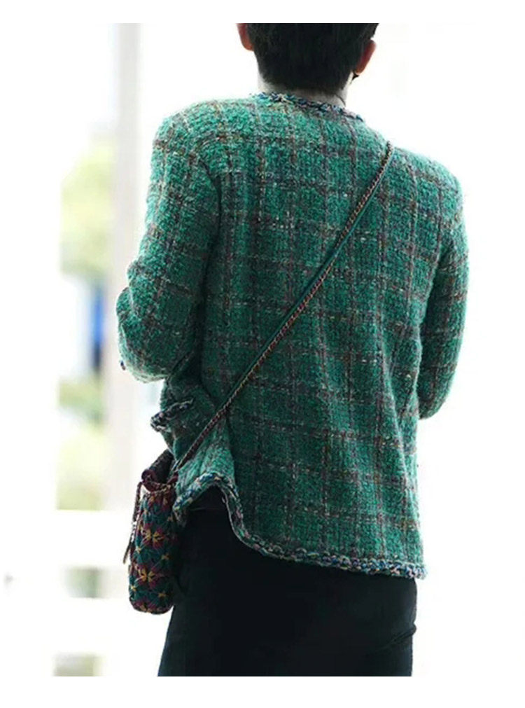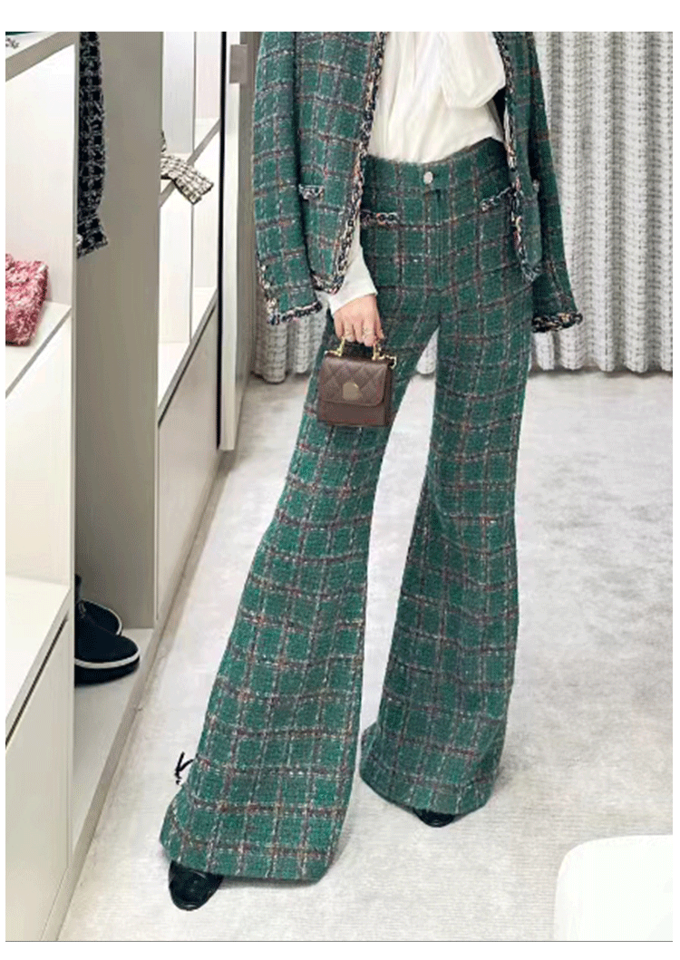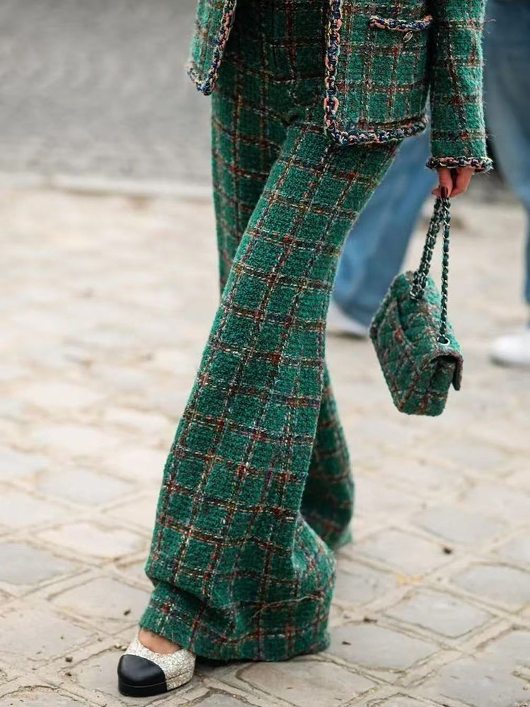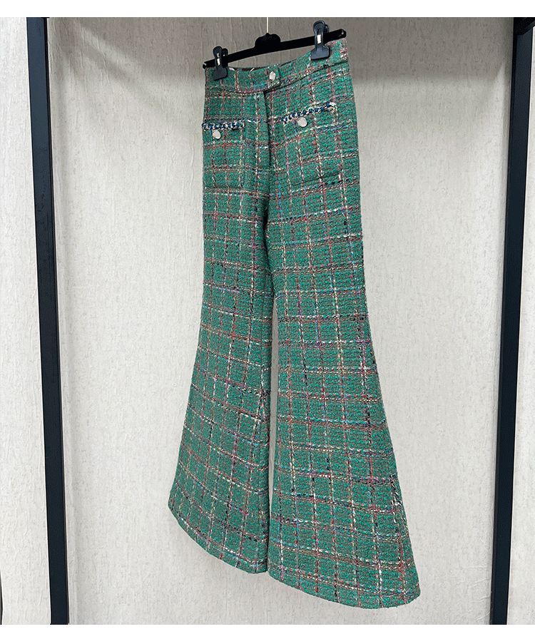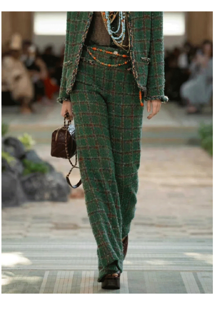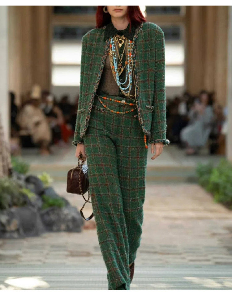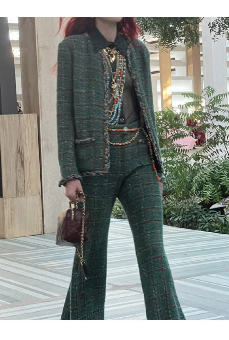 New suit jacket trousers slightly pulled green plaid wool tweed weaving high-end texture celebrity