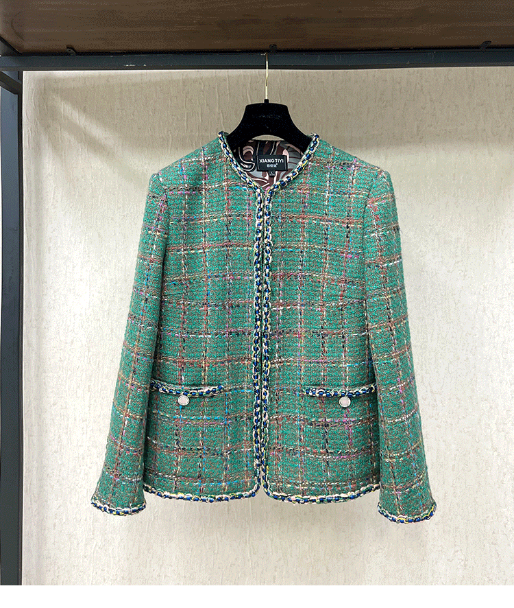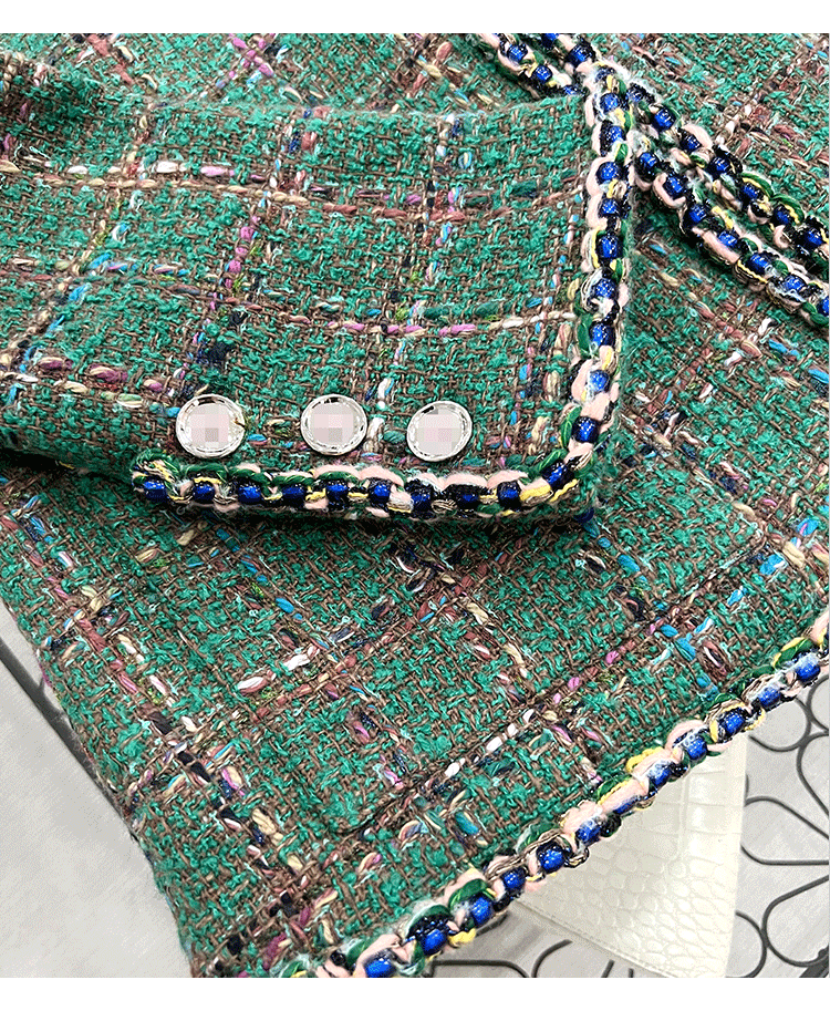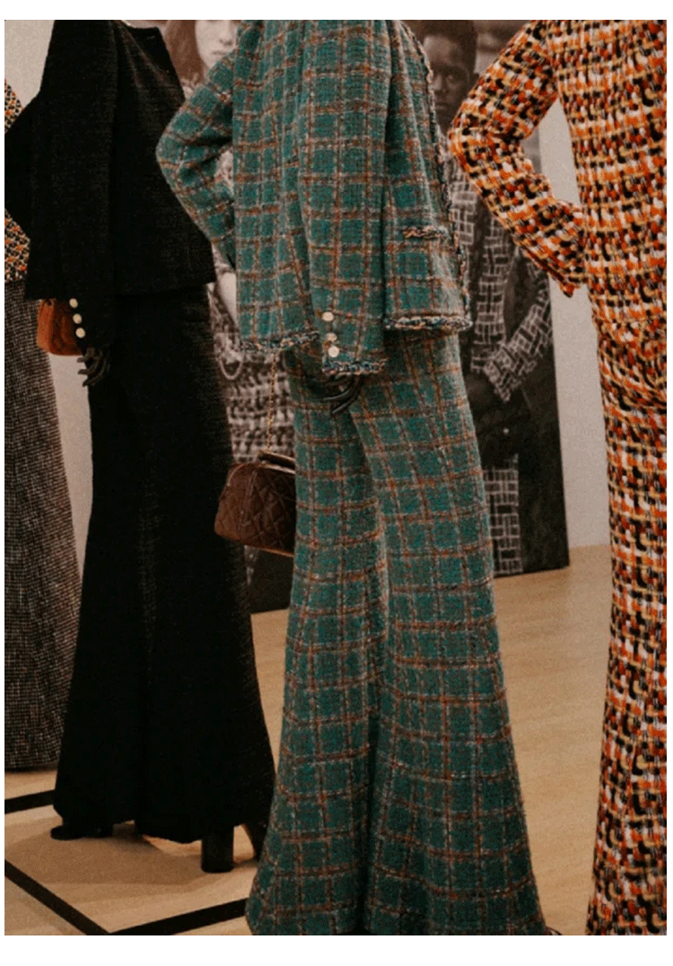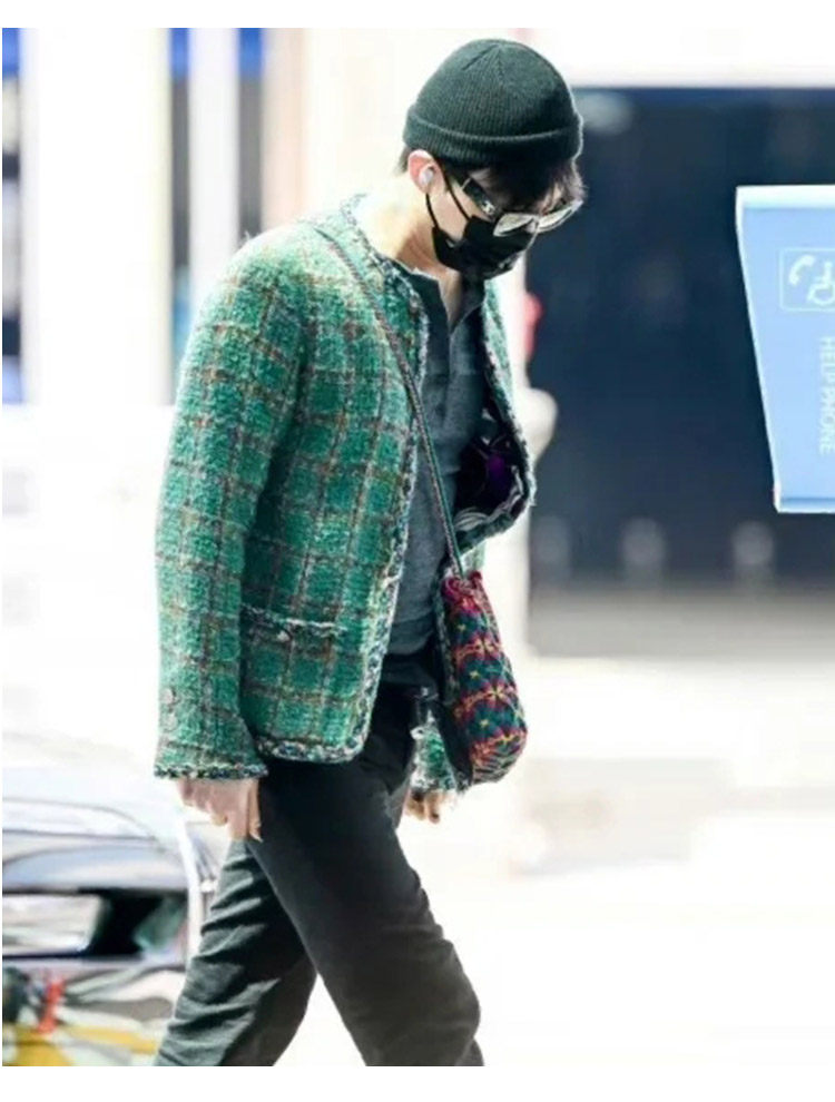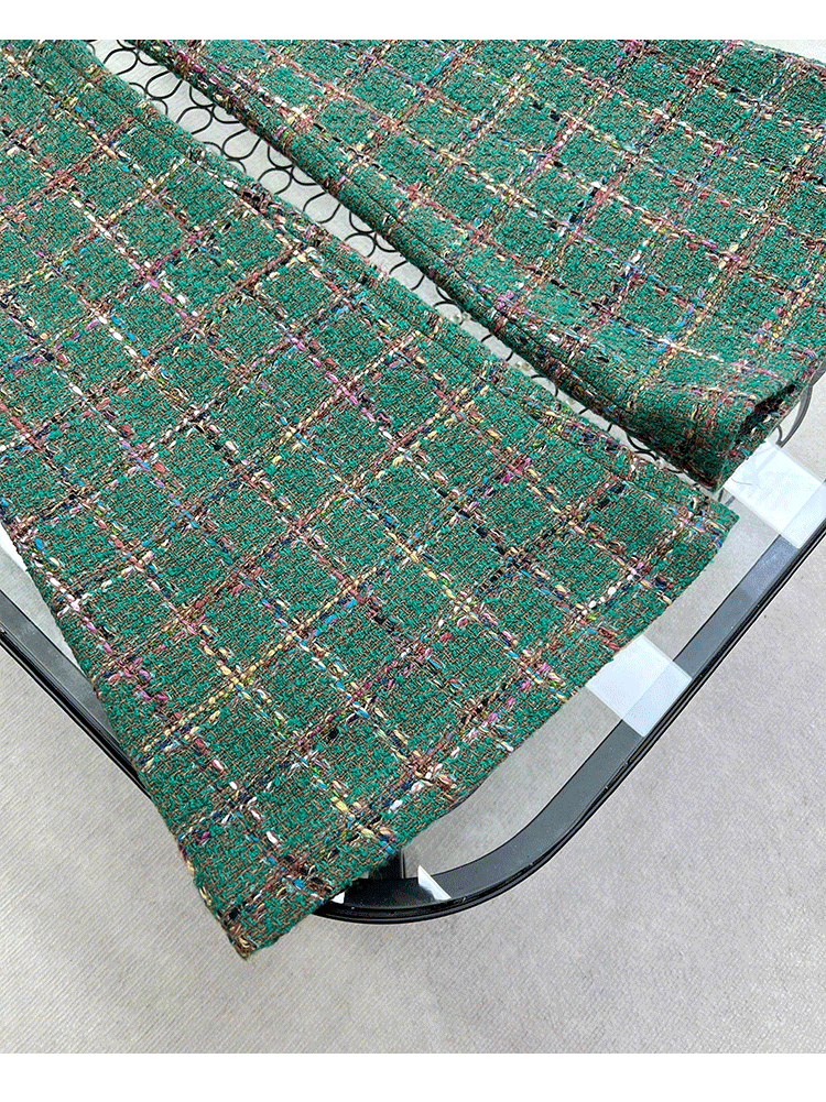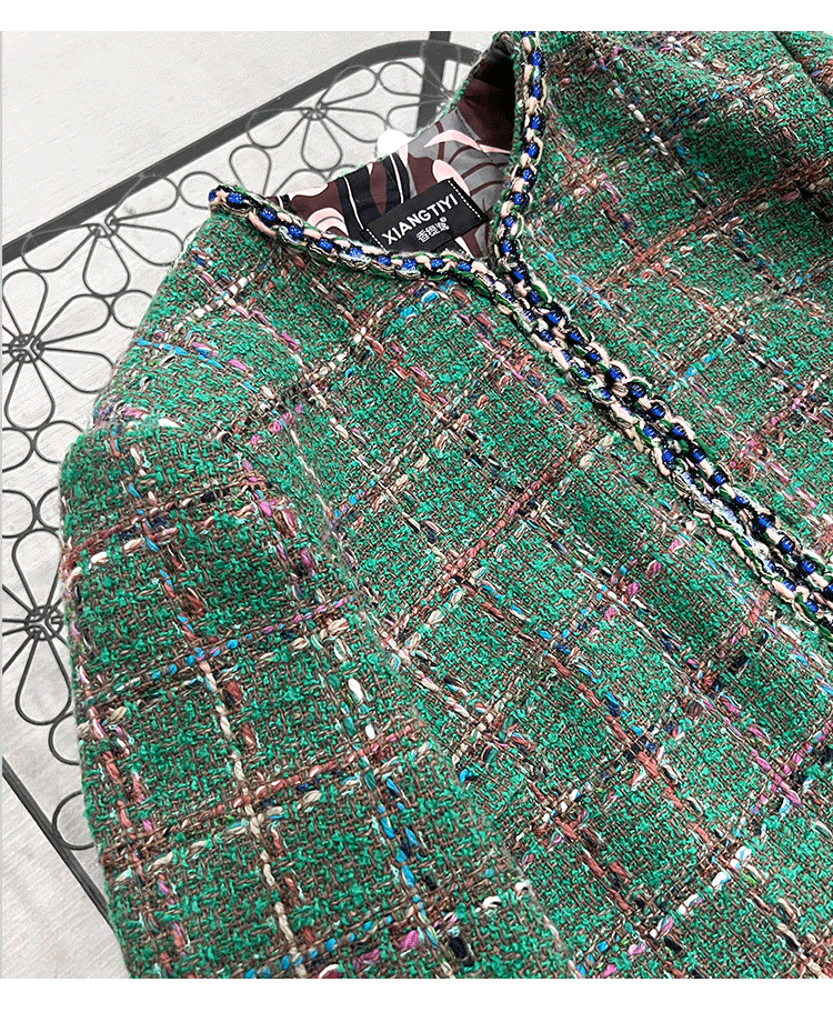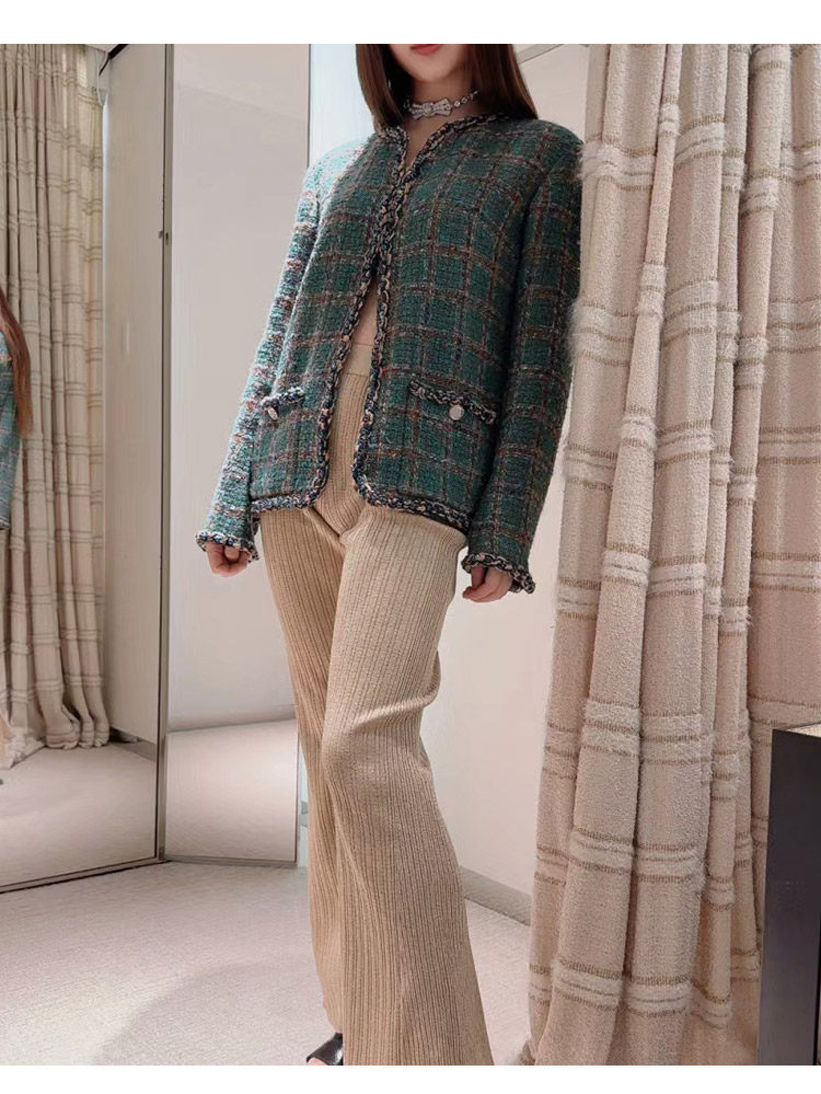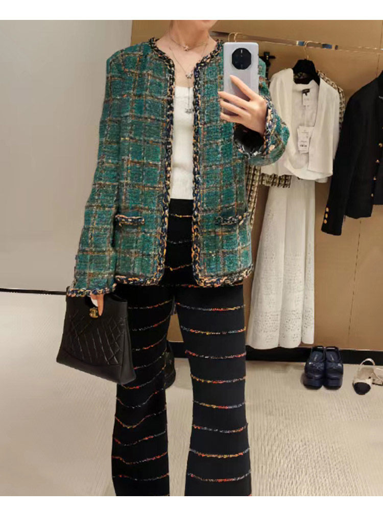 New suit jacket trousers slightly pulled green plaid wool tweed weaving high-end texture celebrity